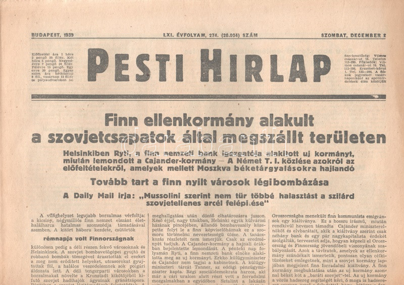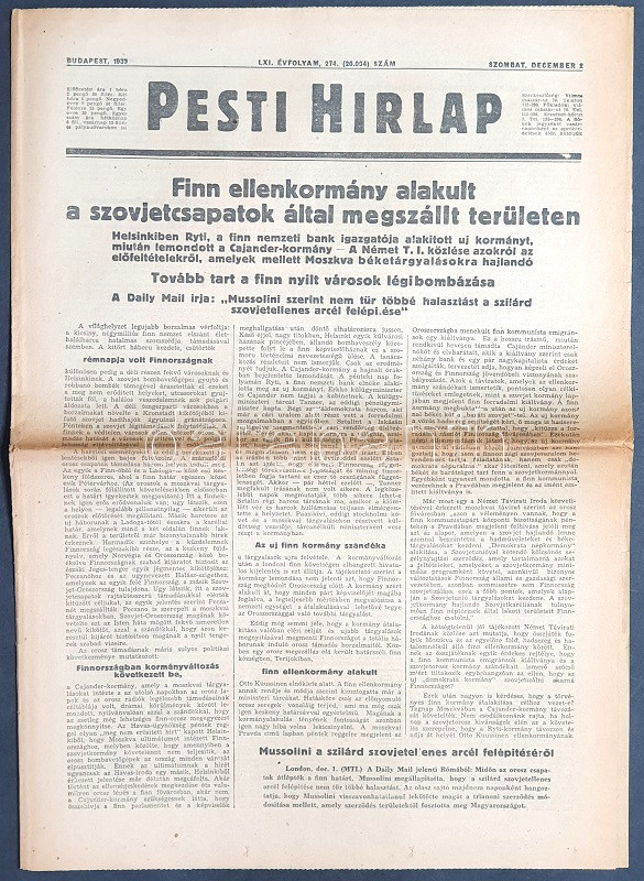 [II. Világháború] Pesti Hirlap. 1939. december 2. (Napilap, LXI. évfolyam, 274. szám) " Finn ellenkormány alakult a szovjetcsapatok által megszállt területen -- Megrázó tudósitások Helsinki légi bombázásáról -- A Német Távirati Iroda jelentése Moszkva álláspontjáról -- Csáky nyilatkozatai." Félbehajtva, jó állapotban.