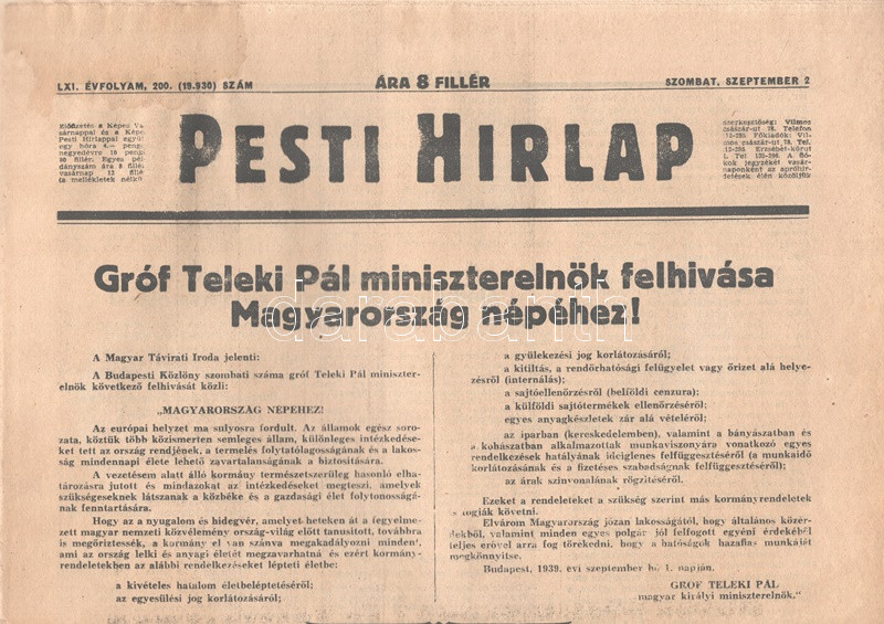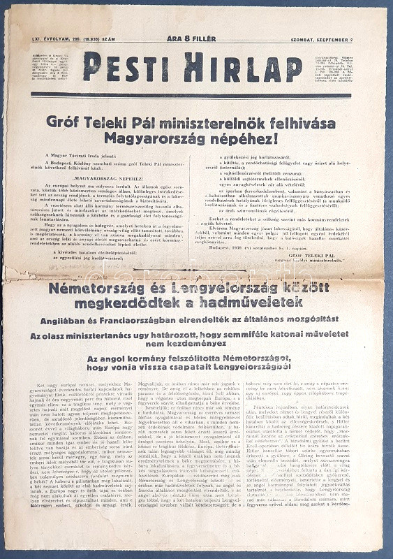"Gróf Teleki Pál miniszterelnök felhívása Magyarország népéhez! -- Németország és Lengyelország között megkezdődtek a hadműveletek -- Angliában és Franciaországban elrendelték az általános mozgósitást -- Az olasz minisztertanács ugy határozott, hogy semmiféle katonai műveletet nem kezdeményez -- Az angol kormány felszólította Németországot, hogy vonja vissza csapatait Lengyelországból." Félbehajtva, jó állapotban.