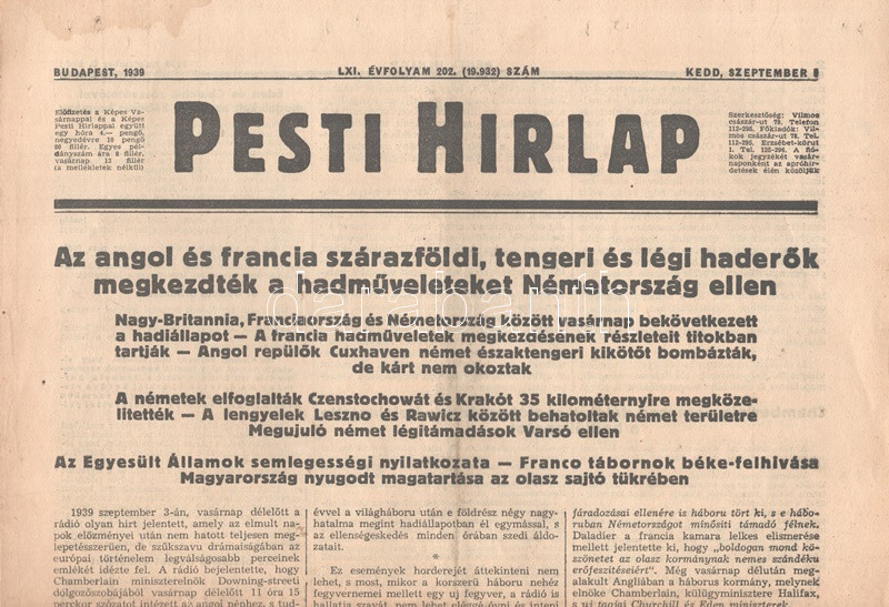 "Az angol és francia szárazföldi, tengeri és légi haderők megkezdték a hadműveleteket Németország ellen -- Nagy-Britannia, Franciaország és Németország között vasárnap bekövetkezett a hadiállapot -- A francia hadműveletek megkezdésének részleteit titokban tartják -- Angol repülők Cuxhaven német északtengeri kikötőt bombázták, de kárt nem okoztak -- A németek elfoglalták Czenstochowát és Krakót 35 kilométernyire megközelítették -- A lengyelek Leszno és Rawicz között behatoltak német területre -- Megujuló német légitámadások Varsó ellen -- Az Egyesült Államok semlegességi nyilatkozata -- Franco tábornok béke-felhivása -- Magyarország nyugodt magatartása az olasz sajtó tükrében." Félbehajtva, jó állapotban.