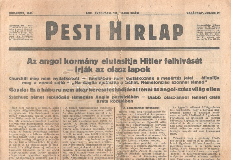 "Az angol kormány elutasitja Hitler felhivását - irják az olasz lapok -- Churchill még nem nyilatkozott -- Angliában nem mutatkoznak megértés jelei - állapitja meg a német sajtó -- "Ha Anglia elutasítja a békét, Németország azonnal támad" -- Gayda: Ez a háború nem akar kereszteshadjárat lenni az angol-szász világ ellen -- Százhusz német repülőgép támadása Anglia partvidékén -- Ujabb olasz-angol tengeri csata Kréta közelében." Félbehajtva, jó állapotban.