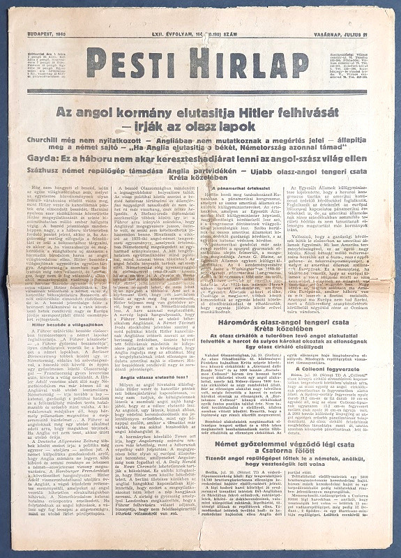 [II. Világháború] Pesti Hirlap. 1940. julius 21. (Napilap, LXII. évfolyam, 164. szám)