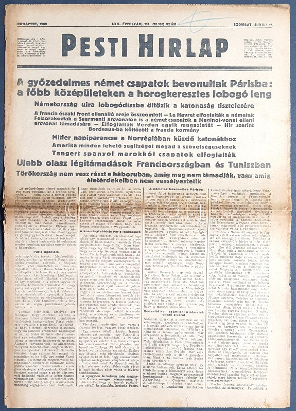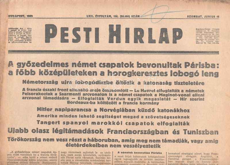 [II. Világháború] Pesti Hirlap. 1940. junius 15. (Napilap, LXII. évfolyam, 134. szám) "A győzedelmes német csapatok bevonultak Párisba: a főbb középületeken a horogkeresztes lobogó leng -- Ujabb olasz légitámadások Franciaországban és tuniszban -- Olasz hadműveletek -- Páris meghódolása." Félbehajtva, jó állapotban.