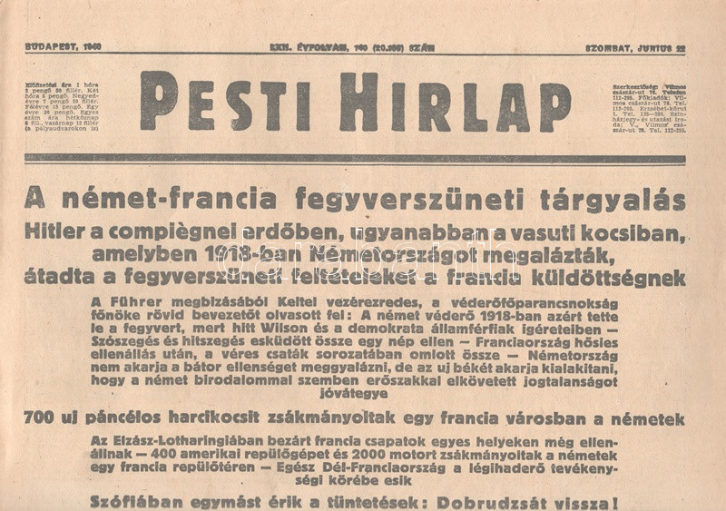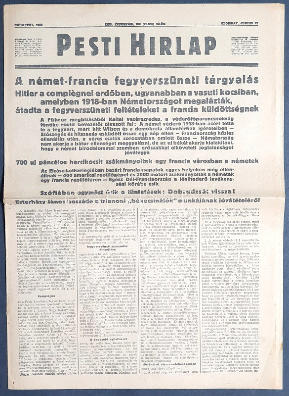 [II. Világháború] Pesti Hirlap. 1940. junius 22. (Napilap, LXII. évfolyam, 140. szám) "A német-francia fegyverszüneti tárgyalás -- Nyugati hadműveletek -- Hitler a compiegnei erdőben, ugyanabban a vasúti kocsiban, amelyben 1918-ban Németországot megalázták, átadta a fegyverszüneti feltételeket a francia küldöttségnek" Félbehajtva, jó állapotban.