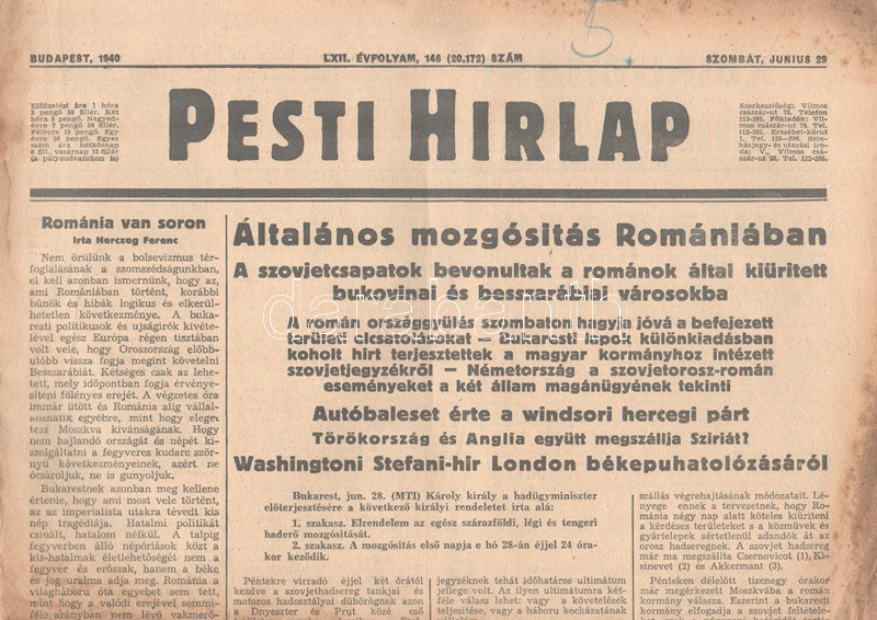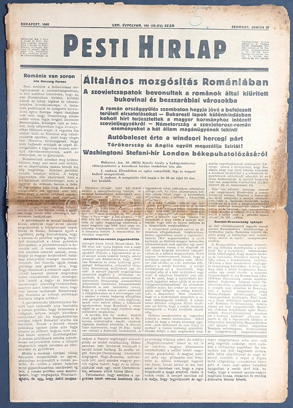 "Általános mozgósítás Romániában -- A szovjetcsapatok bevonultak a románok által kiüritett bukovinai és besszarábiai városokba -- A román országgyülés szombaton hagyja jóvá a befejezett területi elcsatolásokat -- Bukaresti lapok különkiadásban koholt hirt terjesztettek a magyar kormányhoz intézett szovjetjegyzékről -- Németország a szovjetorosz-román eseményeket a két állam magánügyének tekinti -- Autóbaleset érte a windsori hercegi párt -- Törökország és Anglia együtt megszállja Sziriát? -- Washingtoni Stefani-hir London békepuhatolózásáról." Félbehajtva, jó állapotban.