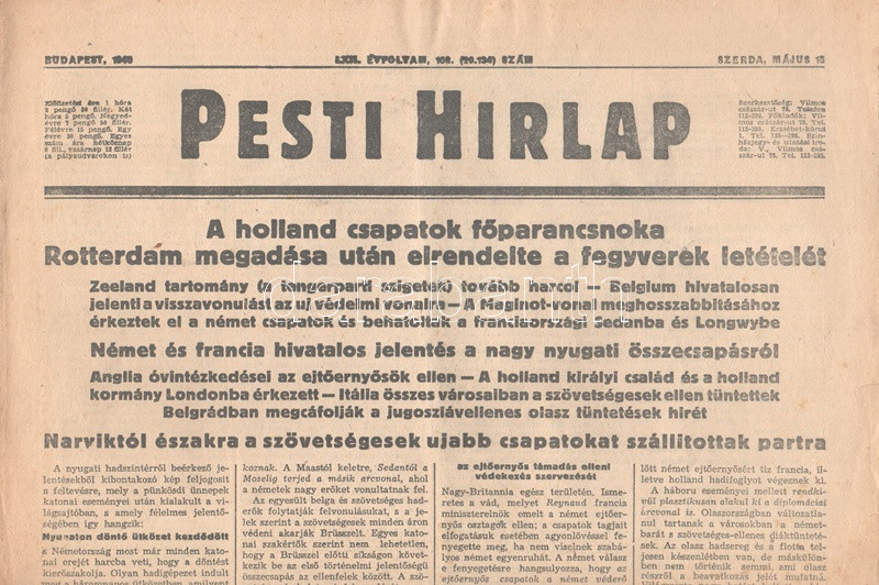 "A holland csapatok főparancsnoka Rotterdam megadása után elrendelte a fegyverek letételét -- Zeeland tartomány (a tengerparti szigetek) tovább harcol -- Belgium hivatalosan jelenti a visszavonulást az uj védelmi vonalra -- A Maginot-vonal meghosszabbításához érkeztek el a német csapatok és behatoltak a franciaországi Sedanba és Longwybe -- Német és francia hivatalos jelentés a nagy nyugati összecsapásról - Anglia óvintézkedései az ejtőernyősök ellen -- A holland királyi család és a holland kormány Londonba érkezett -- Itália összes városaiban a szövetségesek ellen tüntettek -- Belgrádban megcáfolják a jugoszlávellenes olasz tüntetések hirét." Félbehajtva, jó állapotban.