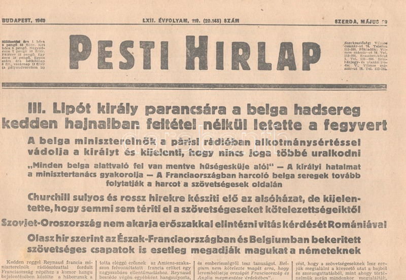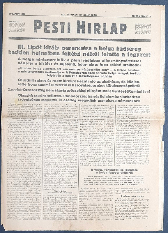 "III. Lipót király parancsára a belga hadsereg kedden hajnalban feltétel nélkül letette a fegyvert -- A belga miniszterelnök a párisi rádióban alkotmánysértéssel vádolja a királyt és kijelenti, hogy nincs joga többé uralkodni -- "Minden belga alattvaló fel van mentve hűségesküje alól" -- A királyi hatalmat a minisztertanács gyakorolja -- A Franciaországban harcoló belga seregek tovább folytatják a harcot a szövetségesek oldalán -- Churchill sulyos s rossz hirekre késziti elő az alsóházat, de kijelentette, hogy semmi sem tériti el a szövetségeseket kötelezettségeiktől -- Szovjet-Oroszország nem akarja erőszakkal elintézni vitás kérdését Romániával -- Olasz hir szerint az Észak-Franciaországban és Belgiumban bekeritett szövetséges csapatok is esetleg megadják magukat a németeknek." Félbehajtva, jó állapotban.