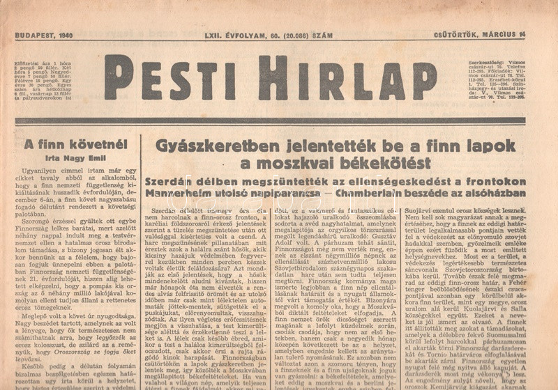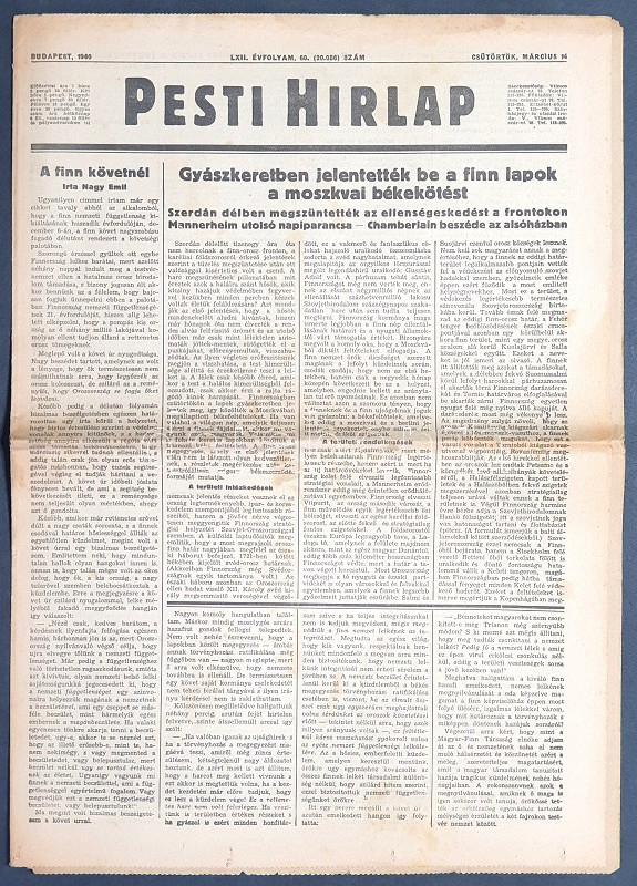 [II. Világháború] Pesti Hirlap. 1940. március 14. (Napilap, LXII. évfolyam, 60. szám) "Gyászkeretben jelentették be a finn lapok a moszkvai békekötést -- Kisérteties csend a fegyverszünet óta a karéliai földszoroson -- Tanner drámai rádióbeszéde -- Félárbocon a finn lobogók -- Roosevelt nyilatkozata -- A finn-szovjetorosz béke külföldi visszhangja -- Az uj finn-szovjet-orosz határ -- Izgalmas telefonbeszélgetés szerdán hajnalban a tájékozatlan Helsinkivel -- Londonban egy hindu agyonlőtte Pendzsab volt kormányzóját." Félbehajtva, jó állapotban.