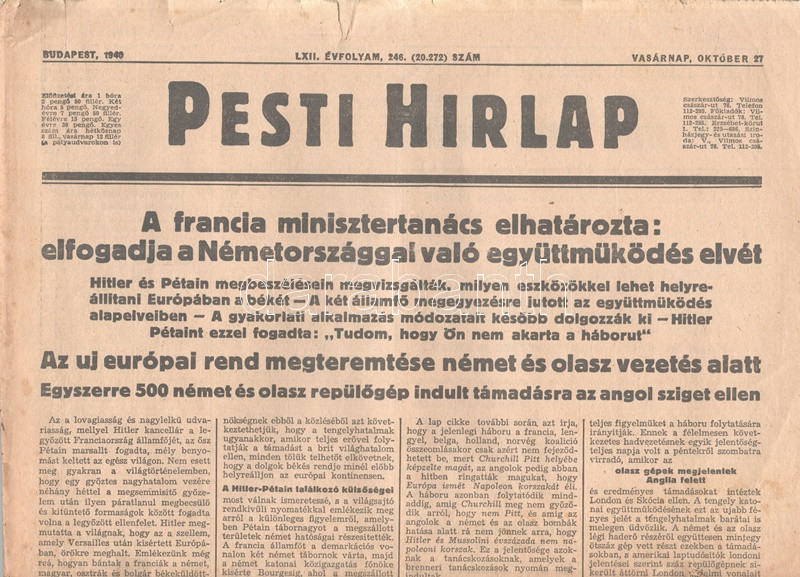 [II. Világháború] Pesti Hirlap. 1940. október 27. (Napilap, LXII. évfolyam, 246. szám) "A francia minisztertanács elhatározta: elfogadja a Németországgal való együttmüködés elvét -- Hitler és Pétai megbeszélésein megvizsgálták, milyen eszközökkel lehet helyreállitani Európában a békét-A két államfő megegyezésre jutott az együtmüködés alapelveiben-A gyakorlati alkalmazás módozatait később dolgozzák ki-Hitler Pétaint ezzel fogadta: "Tudom, hogy Ön nem akarta a háborút" -- Az uj európai rend megteremtése német és olasz vezetés alatt -- Német-francia együttmüködés -- A francia lélek néma forradalma." Félbehajtva, jó állapotban.