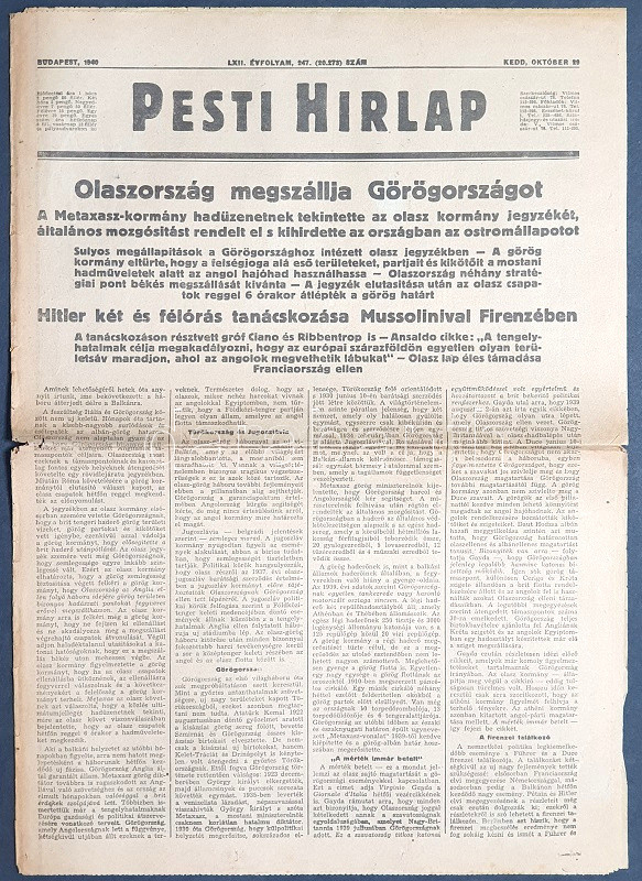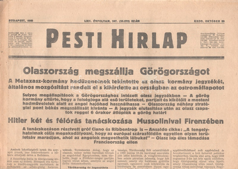 [II. Világháború] Pesti Hirlap. 1940. október 29. (Napilap, LXII. évfolyam, 247. szám) "Olaszország megszállja Görögországot -- A Mataxasz-kormány hadüzenetnek tekintette az olasz kormány jegyzékét, általános mozgósitást rendelt el s kihirdette az országban az ostromállapotot -- Hitler két és fél órás tanácskozása Mussolinival Firenzében -- Német-angol hadműveletek -- A Hitler-Pétain találkozó után -- Az olasz görög háboru -- Az első görög hadijelentés -- Szendy Károly költségvetési beszéde." Félbehajtva, jó állapotban.