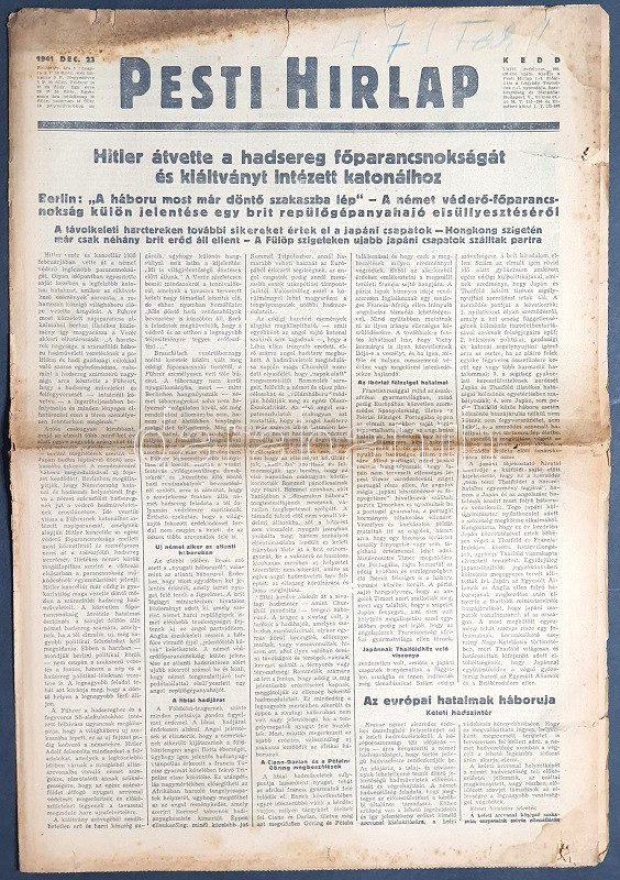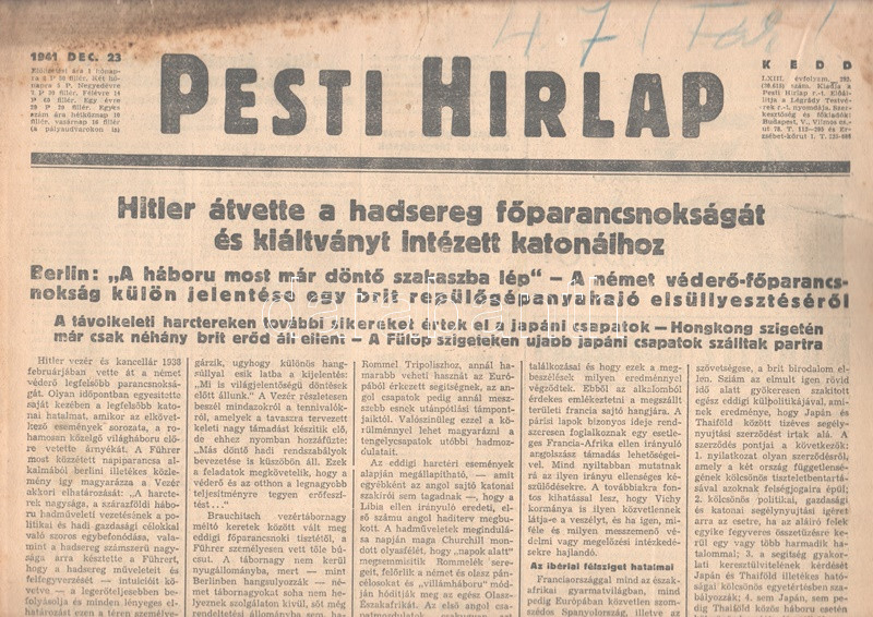 [II. Világháború] Pesti Hirlap. 1941. december 23. (Napilap, LXIII. évfolyam, 292. szám) "Hitler átvette a hadsereg főparancsnokságát és kiáltványt intézett katonáihoz -- Berlin: "A háboru most már döntő szakaszba lép" -- A német véderő-főparancsnokság külön jelentése egy brit repülőgépanyahajó elsüllyesztéséről -- A távolkeleti harctereken további sikereket értek el a japáni csapatok -- Hongkong szigetén már csak néhány brit erőd áll ellent -- A Fülöp szigeteken ujabb japáni csapatok szálltak partra." Félbehajtva, jó állapotban.