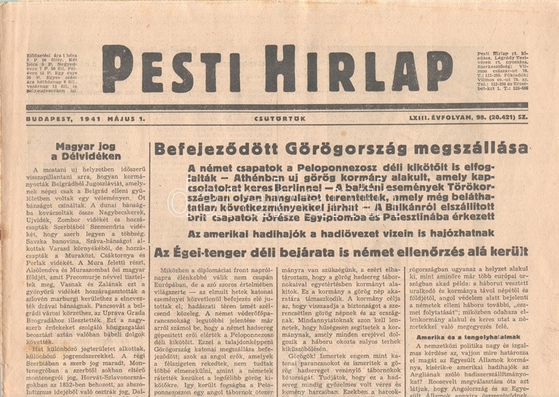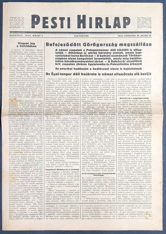 [II. Világháború] Pesti Hirlap. 1941. május 1. (Napilap, LXIII. évfolyam, 98. szám) "Befejeződött Görögország megszállása -- A német csapatok a Peloponnezosz déli kikötőt is elfoglalták -- Athénban uj görög kormány alakult , amely kapcsolatokat keres Berlinnel -- A balkáni események Törökországban olyan hangulatot teremtettek, amely még beláthatatlan következményekkel járhat -- A Balkánról elszállitott brit csapatok jórésze Egyiptomba és Palesztinába érkezett -- Az amerikai hadihajók a hadiövezet vizein is hajózhatnak -- Az Égei-tenger déli bejárata is német ellenőrzés alá került -- Magyar jog Délvidéken." Félbehajtva, jó állapotban.