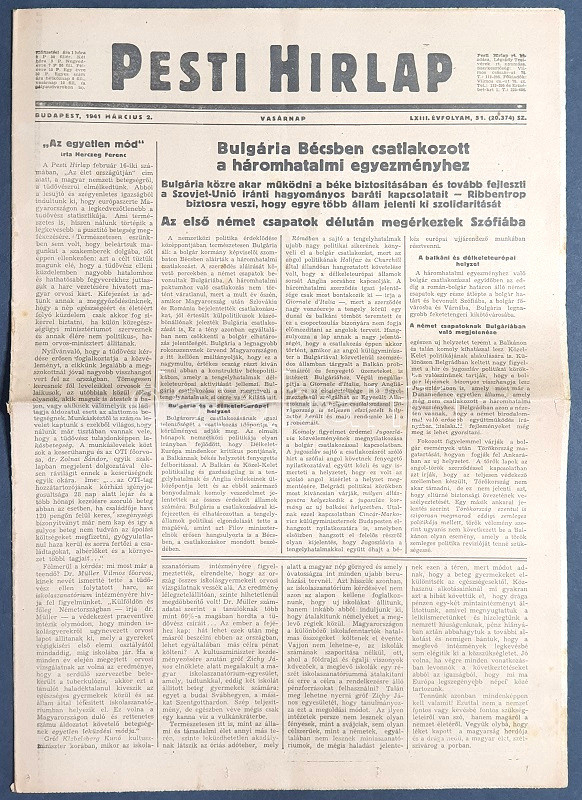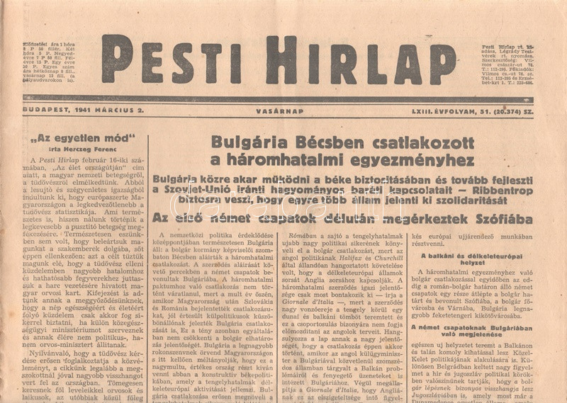 [II. Világháború] Pesti Hirlap. 1941. március 2. (Napilap, LXIII. évfolyam, 51. szám) "Bulgária Bécsben csatlakozott a háromhatalmi egyezményhez -- Bulgária közre akar működni a béke biztositásában és tovább fejleszti a Szovjet-Unió iránti hagyományos baráti kapcsolatait -- Ribbentrop biztosra veszi, hogy egyre több állam jelenti ki szolidaritását -- Az első német csapatok délután megérkeztek Szófiába." Félbehajtva, jó állapotban.