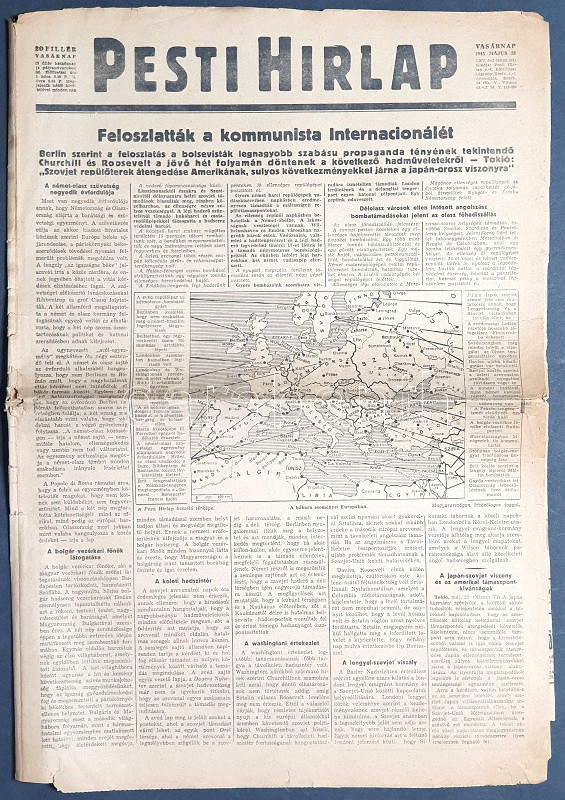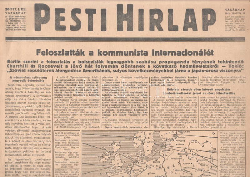 [II. Világháború] Pesti Hirlap. 1943. május 23. (Napilap, LXV. évfolyam, 116. szám) "Feloszlatták a kommunista Internacionálét -- Berlin szerint a feloszlatás a bolsevisták legnagyobb szabásu propaganda tényének tekintendő -- Churchill és Roosevelt a jövő hét folyamán döntenek a következő hadműveletekről -- Tokió: "Szovjet repülőterek átengedése Amerikának, sulyos következményekkel járna a japán-orosz viszonyra -- A német-olasz szövetség negyedik évfordulója -- Délolasz városok ellen intézett angolszász bombatámadásokat jelent az olasz főhadiszállás." Félbehajtva, jó állapotban.