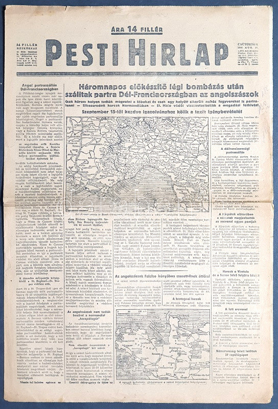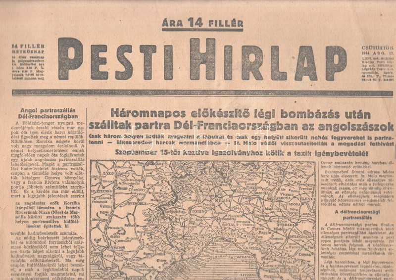 [II. Világháború] Pesti Hirlap. 1944. augusztus 17. (Napilap, LXVI. évfolyam, 183. szám) "Háromnapos előkészítő légi bombázás után szálltak partra Dél-Franciaországban az angolszászok -- Csak három helyen megvetni a lábukat és csak egy helyütt sikerült nehéz fegyvereket is partra tenni -- Elkeseredett harcok Normandiában -- St. Malo védői visszautasították a megadási felhivást -- Szeptember 15-től kezdve igazolványhoz kötik a taxik igénybevételét -- A délfranciaországi partraszállás." Félbehajtva, jó állapotban.