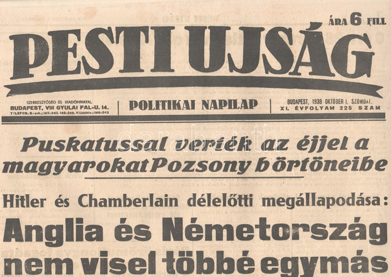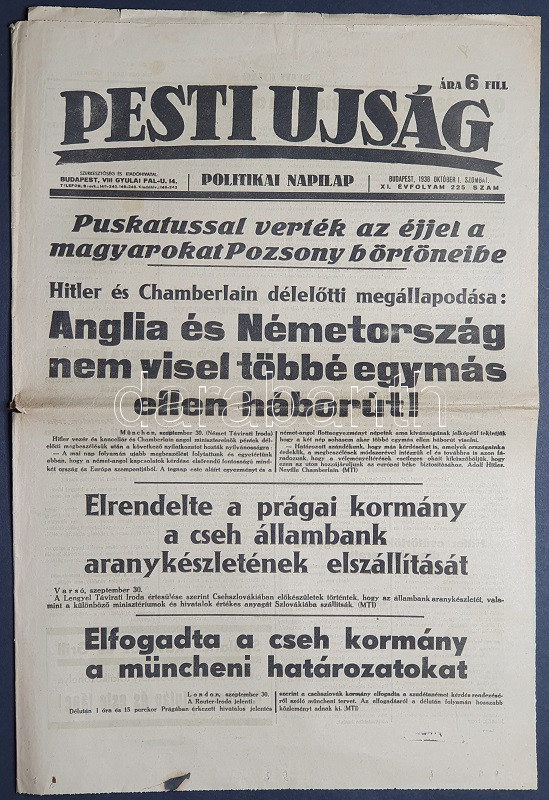[II. Világháború] Pesti Újság. 1938. október 1. (Napilap, XI. évfolyam 225. szám) "Anglia és Németország nem visel többé egymás ellen háborút! -- Elrendelte a prágai kormány a cseh állambank aranykészletének elszállítását -- Elfogadta a cseh kormány a müncheni határozatokat". Félbehajtva, jó állapotban.