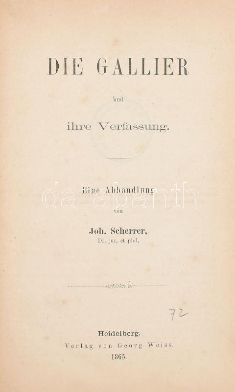 Johann Scherrer: Die Gallier und ihre Verfassung. Heidelberg, 1865, Georg Weiss, 72 p. Átkötött félvászon-kötés, kissé kopott borítóval, régi könyvtári bélyegzéssel és címkével.