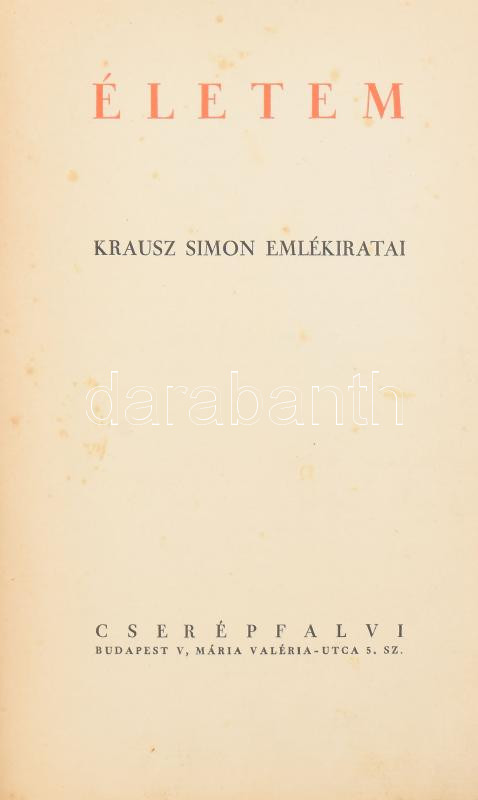 Krausz Simon: Életem. Bp.,én.,Cserépfalvi, 356+4 p. Átkötött félvászon... https://www.darabanth.com/de/472-Fernauktion/472.0/Bucher/Bucher-Geschichte~500020/Krausz-Simon-Eletem-Bp-en-Cserepfalvi-356plus4-p-Atkotott-felvaszon-kotes-kopott-bori~II3166915