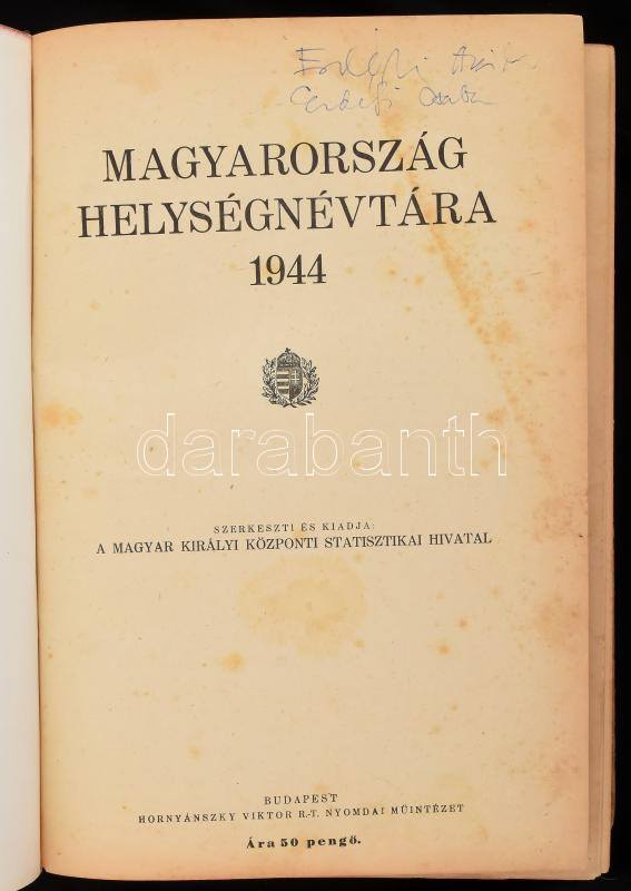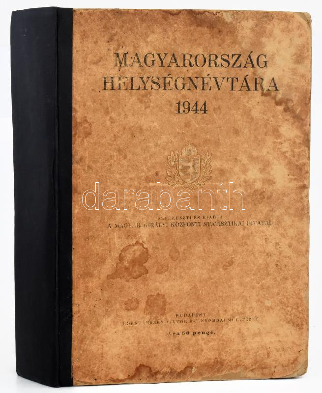 Magyarország helységnévtára 1944. Szerk.: M. Kir. Központi Statisztikai Hivatal. Bp., [1944], Hornyánszky Viktor Rt.,XII+680 p. Félvászon-kötésben, foltos borítóval