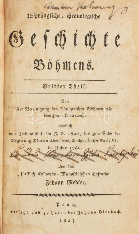 Mehler, Johann: Ursprüngliche, chronologische Geschichte Böhmens. Dritter Theil. Prag, 1807, Johann Diesbach, 388+12+79+1 p. Német nyelven. Korabeli félbőr-kötésben, kopott borítóval, sérült gerinccel, foltos lapokkal, a címlapon bejegyzésekkel.