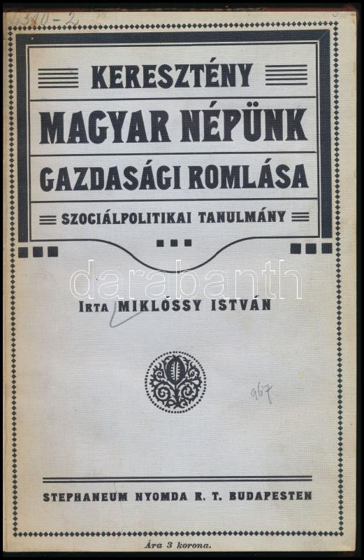 Miklóssy István: Keresztény magyar népünk gazdasági romlása. Szociálpolitikai tanulmány. Bp., 1913., Stephaneum, 152 p. Átkötött félvászon-kötésben, bekötött papírborítókkal, volt könyvtári példány.