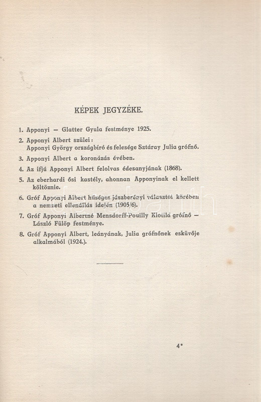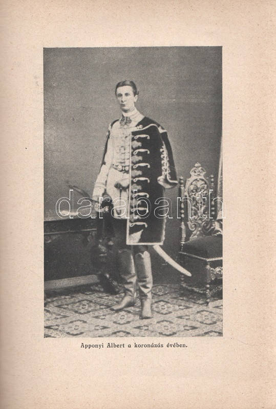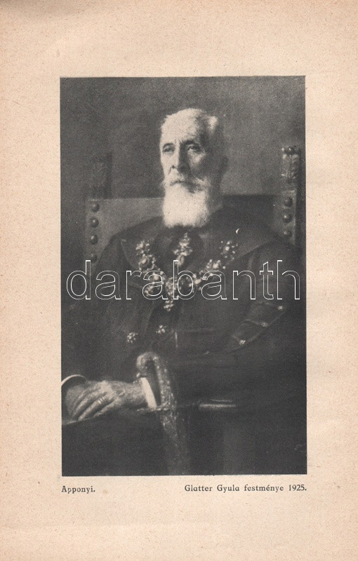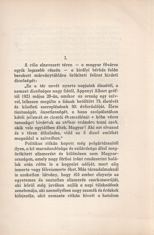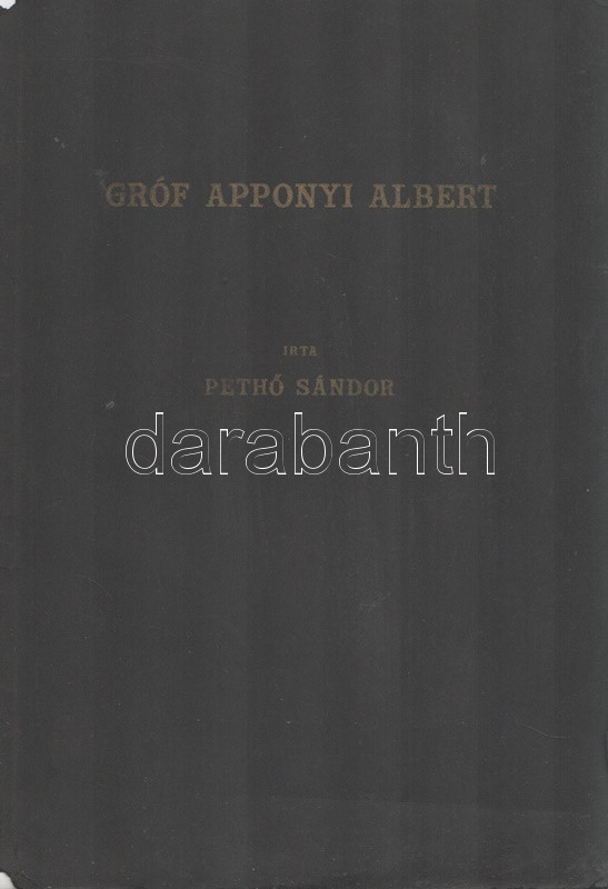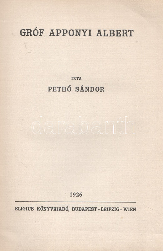 Pethő Sándor: Gróf Apponyi Albert, Budapest-Leipzig-Wien, 1926. Eligius Könyvkiadó (Pallas Rt. ny.) 1 t. (címkép) + 50 + [2] p. + 7 t. Egyetlen magyar kiadás. Apponyi Albert (1846-1933) jogászról, országgyűlési képviselőről, nemzetközi hírnevű szónokról írt pályakép. A dualizmus korától a trianoni békediktátumon át a Horthy-korszakig itthon és külföldön egyaránt aktív államférfi kivételes szónoki képességeit Európa-szerte elismerték. A sorozatcímlap szerint kiadványunk a német nyelvű ,,Das moderne Ungarn" életműsorozat magyar nyelvű kiadványa. Példányunk fűzése kissé meglazult. (Magyarország nagyjai sorozat.) Fűzve, feliratozott, enyhén sérült kiadói borítóban.