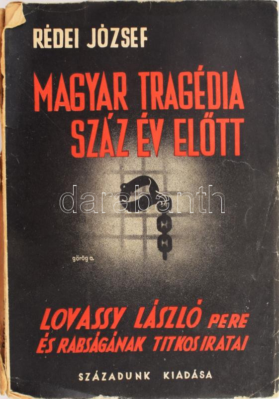 Rédei József: Magyar tragédia száz év előtt. Lovassy László pere és rabságának titkos iratai. Bp, 1938, Századunk. Kiadói papírkötés, sérült borítóval és gerinccel.