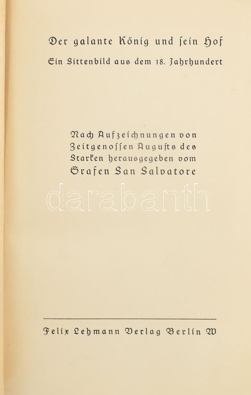 San Salvatore: Der galante König und sein Hof. Ein Sittenbild aus dem 18. Jahrhundert. Berlin,1913 ,Felix Lehmann, 1 t.+ 469+3 p. + 8 t. Német nyelven. Kiadói félbőr-kötés, festett lapélekkel, kopott borítóval.