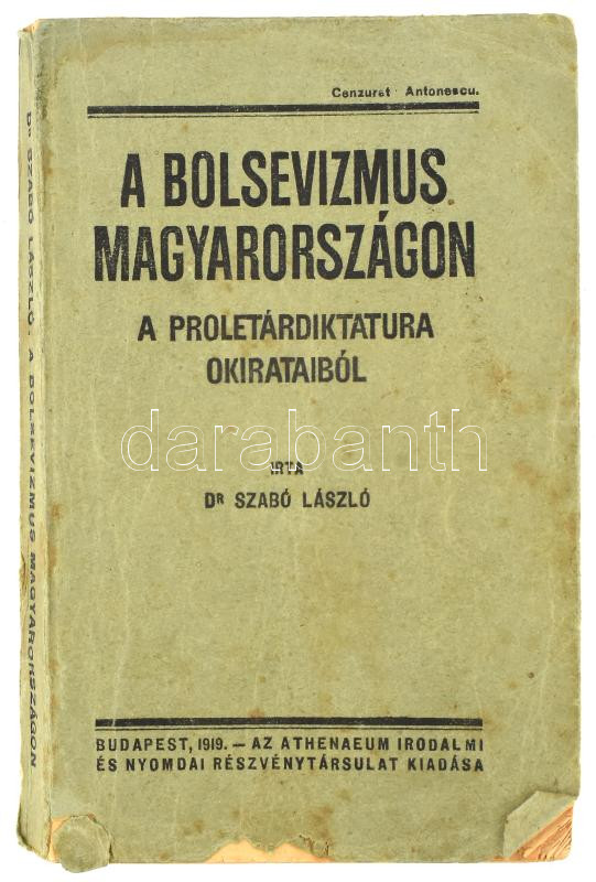 Szabó László: A bolsevizmus Magyarországon. A proletárdiktatura okirataiból. Bp., 1919., Athenaeum, 240 p. Kiadói papírkötés, szakadt, foltos borítóval, sérült, foltos címlappal.