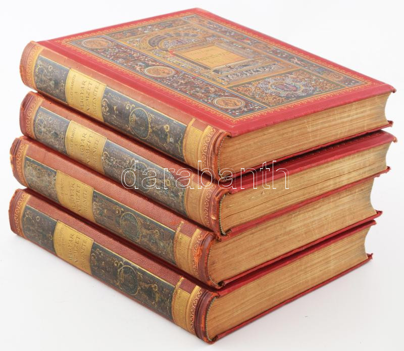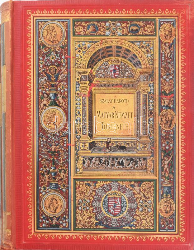 Szalay József - Baróti Lajos: A magyar nemzet története. I-IV. kötet. [Teljes]. I. köt.: Magyarország az Árpádház kihaltáig. 250 szövegképpel és 34 műmelléklettel.; II. köt.: Magyarország a vegyes házakból származott királyok korában. 250 szövegképpel és 19 műmelléklettel.; III. köt: Magyarország a Habsburg-házból való választott királyok korában. 325 szövegképpel és 29 műmelléklettel.; IV. köt.: Magyarország a Habsburg-házból s a Habsburg-Lotharingiai házból származott örökös királyok korában. 248 szövegképpel és 36 műmelléklettel. Bp., [1895-1898], Lampel Róbert (Wodianer F. és Fiai). Rendkívül gazdag szövegközi és egészoldalas illusztrációval, térképekkel, kihajtható mellékletekkel. Kiadói dúsan aranyozott, festett, félbőr-kötés, jó állapotban, a IV. kötet gerince enyhén sérült, egy lap kijár, az előzéklapokon foxing.