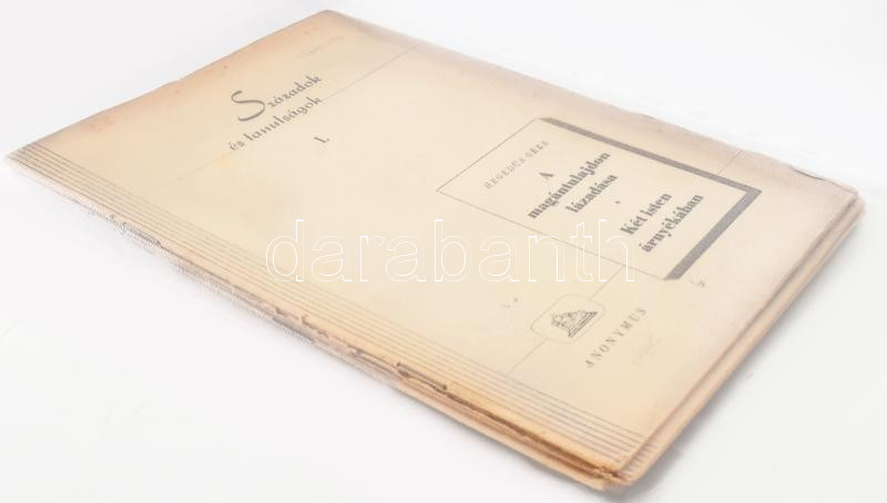 Századok és tanulságok I-IV. köt. I. köt.: Hegedűs Géza: A magántulajdon lázadása. Két isten árnyékában.; II. köt.: Kemény G. Gábor: A népjog krónikása. Csehek és székelyek. Pesti kalmárok.; III. köt.: Káldy Kristóf: Mátyás az igazságkereső. Kemény G. Gábor: Pártütő tudósok.; IV. köt.: Kelemen János: Dózsa György. Bp.,(1945.),Anonymus, 1-16,17-32,33-48, 49-64 p. Kiadói papírkötések, szakadt, az egyik borító foltos, egy másik borító kissé foltos.