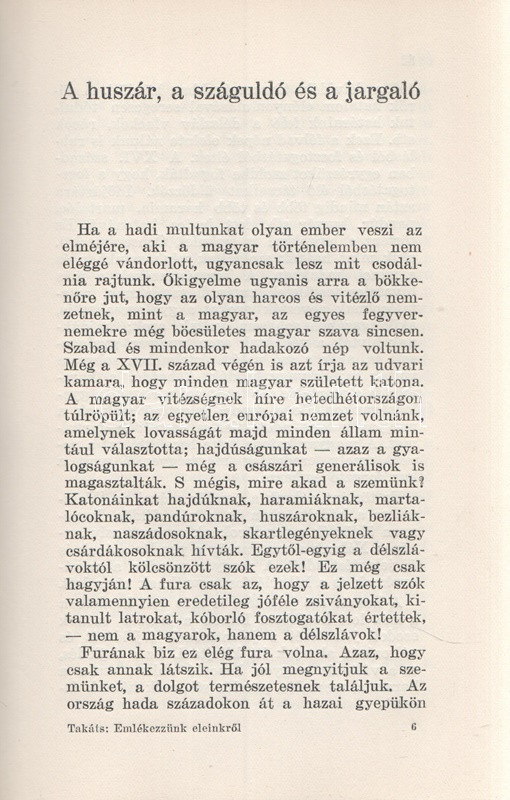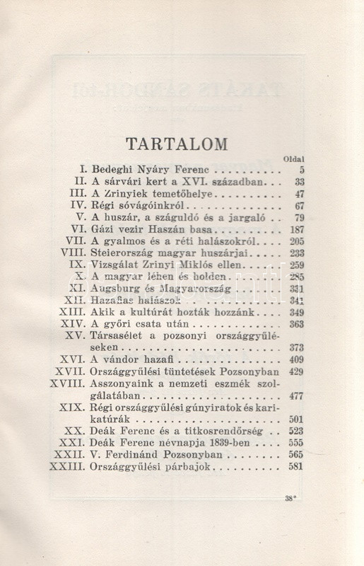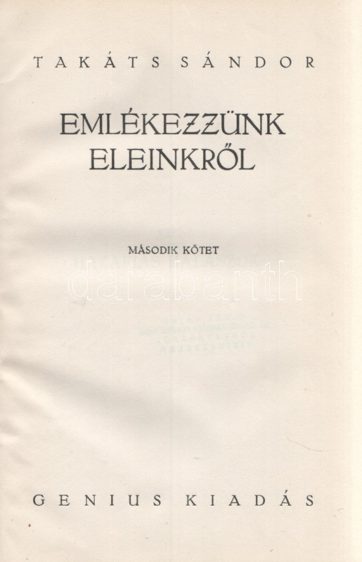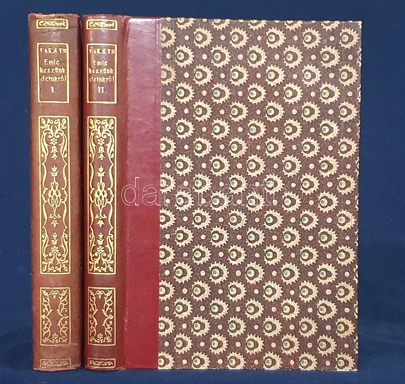 Takáts Sándor: Emlékezzünk eleinkről. 1-2. kötet. [Teljes mű két kötetben.] [Budapest, 1929]. Genius kiadás (Világosság ny.) 340 p.; [4] + [344]-594 + [2] p. Első kiadás. A piarista tanár, művelődéstörténész Takáts Sándor (1860-1932) munkájában a régi magyar végvári- és népéletet, valamint a XIX. század mentalitástörténetét dolgozta fel, részben levéltári, részben titkosrendőrségi források alapján. Az első előzékeken, a címoldalak verzóján és a belív néhány oldalán régi tulajdonosi bélyegzés. Egységes, kiadói, díszesen aranyozott gerincű félbőr kötésben, felül festett lapszélekkel. Szép példány.
