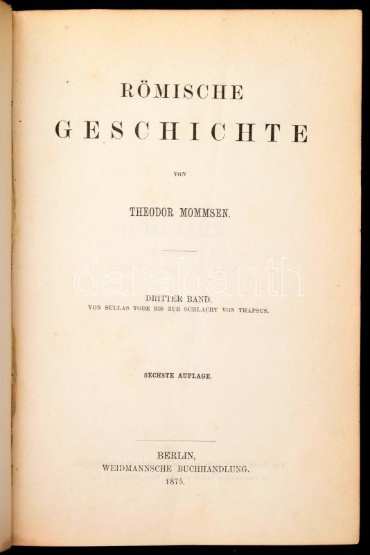 Theodor Mommsen: Römische Geschichte I-III. Bände. Berlin, 1874-1875, Weidmannsche Buchhandlung. Német nyelven. Sechste Auflage. Borító nélküli példányok.