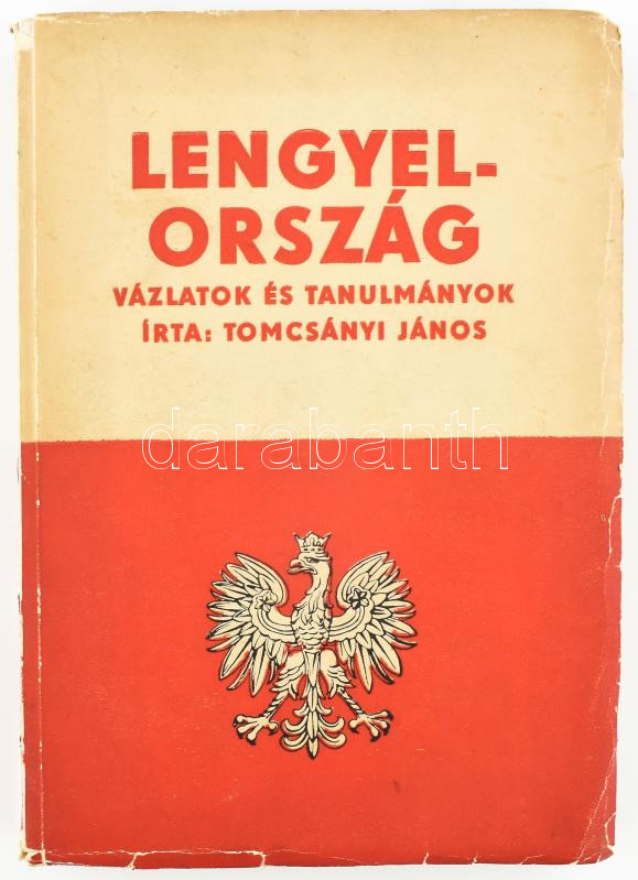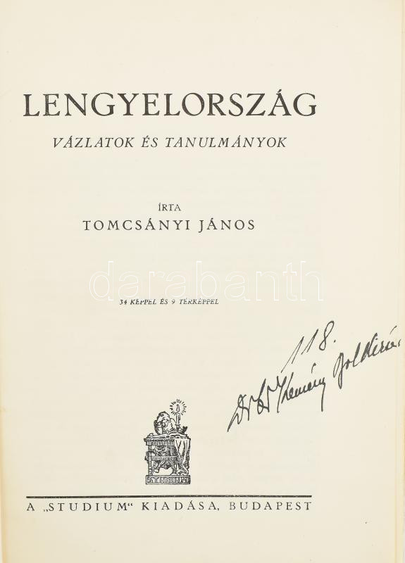 Tomcsányi János: Lengyelország. Vázlatok és tanulmányok. Bp., é.n., Studium. Báró magyargyerőmonostori Kemény Boldizsár (1908-1983) korabeli névbejegyzésével a címlapon. Fekete-fehér fotókkal, 1 kihajtható térképpel. Kiadói papírkötésben, kissé sérült gerinccel, borítón apró szakadásokkal.