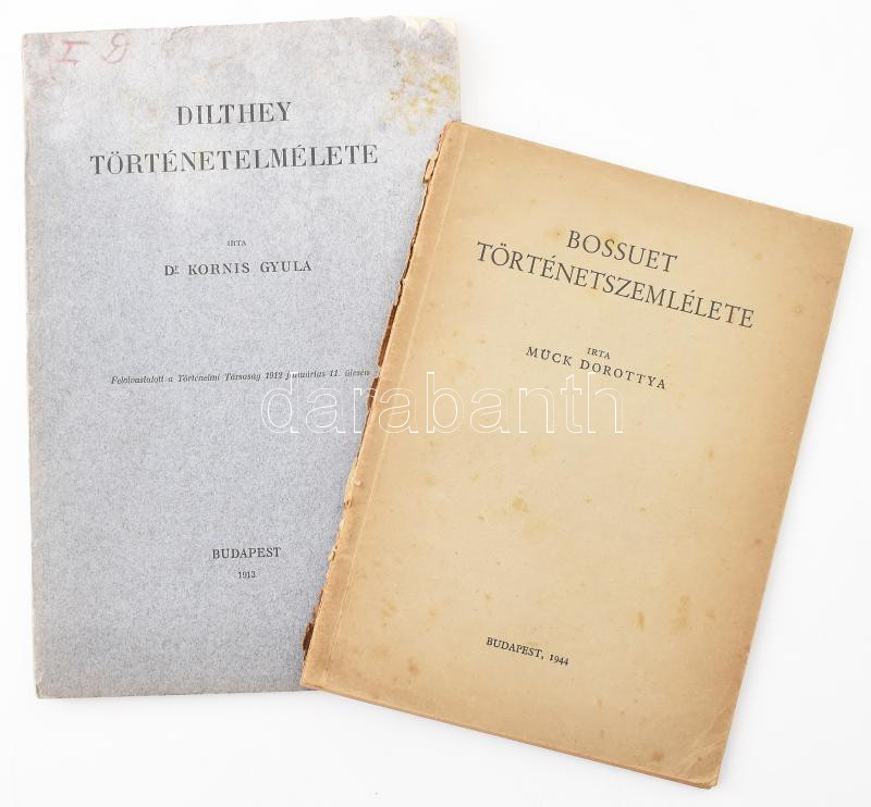 Vegyes könyvtétel, 2 db: Mück Dorottya: Bossuet történelemszemlélete. Bp., 1944, (Athenaeum-ny.), 72+4 p. Kiadói papírkötés, kissé foltos borítóval, sérült gerinccel. Jacques-Bénigne Bossuet (1627-1704) francia katolikus püspök, teológus, író.; Kornis Gyula: Dilthey történetelmélete. Bp., 1913,Franklin, 47 p. Kiadói papírkötés, foltos, rossz állapotban.;