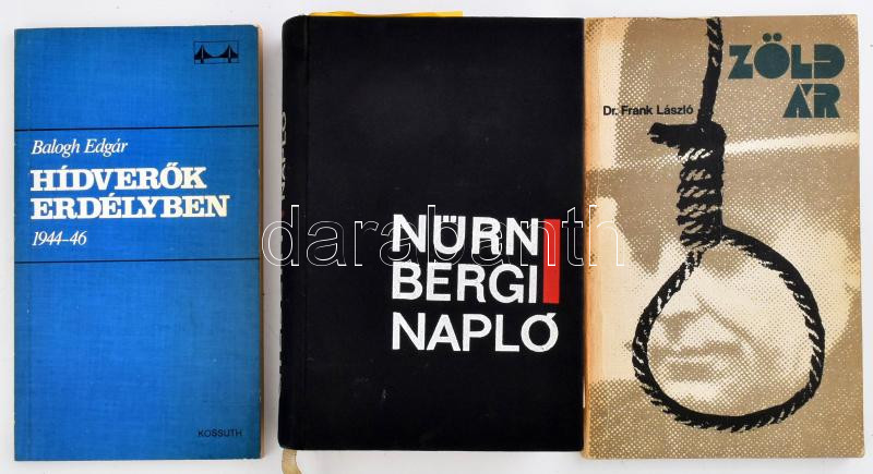 Vegyes könyvtétel, 3 db: G. M. Gilbert: Nürnbergi napló. Bp., 1967, Magvető. Kiadói egészvászon-kötés, benne újságkivágásokkal. Balogh Edgár: Hídverők Erdélyben 1944-46. Bp., 1985, Kossuth. Kiadói papírkötés.; Frank László: Zöld ár. Bp., 1985, Zrínyi. Kiadói papírkötés.;