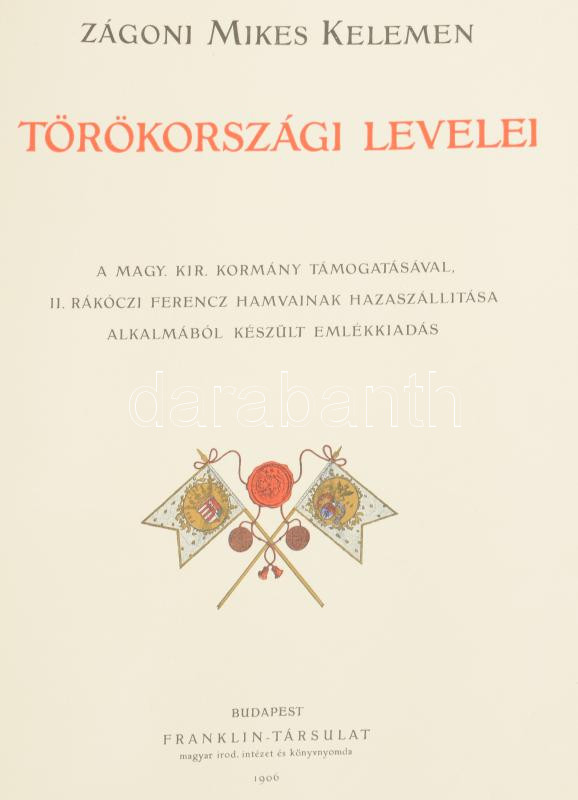 Zágoni Mikes Kelemen Törökországi Levelei. A Magy. Kir. Kormány támogatásával, II. Rákóczi Ferencz hamvainak hazaszállítása alkalmából készült emlékkiadás. Bevezető tanulmányokat írták: Négyesy László, Thaly Kálmán, Beöthy Zsolt, Szily Kálmán, Erődi Béla. A leveleket az eredeti kézirat alapján kiadja: Miklós Ferencz. A díszítéseket rajzolta Edvi Illés Aladár. Bp., 1906, Franklin-Társulat, LXXX+233 p. + 39 t. (ebből 36 színes ) és 3 kézirat-hasonmás. Kiadói dombornyomott, aranyozott egészbőr-kötésben, sarkoknál, széleknél kis kopással