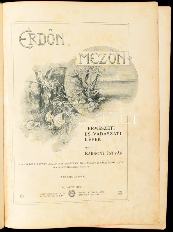 Bársony István: Erdőn-mezőn. Természeti és vadászati képek. Spányi Béla, Pataky László, Mesterházy Kálmán stb. illusztrációival. Bp. 1904. Athenaeum. 253 p. 15 hártyapapaíral védett tábla. Szövegközti képekkel. Festett, újrakötött egészvászon kötésben, az eredeti borító felhasználásával, néhány sérült lappal