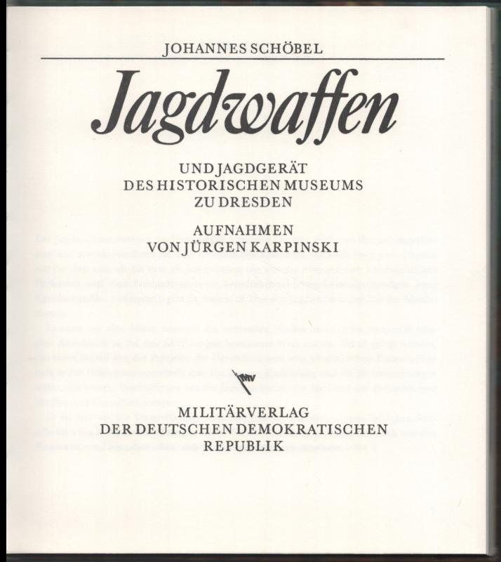 Johannes Schöbel: Jagdwaffen. Berlin, 1980, Militärverlag der DDR. 3. kiadás. 94 p. Német nyelvű könyv vadászfegyverek témában. Színes és fekete-fehér képekkel gazdagon illusztrált. Kiadói kartonált papírkötés.