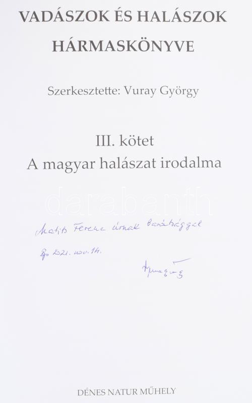 Vuray György (szerk.): Vadászok és halászok hármaskönyve III.. A szerkesztő Vuray György által Matits Ferenc művészettörténész, művészeti író, egyetemi tanár részére DEDIKÁLT! Bp., 2021, Dénes Natura. 319 p +72 p (színes képtáblák). Megjelent 1000 példányban. Színes és fekete-fehér képekkel, többek közt Seuso kincslelettel, Bogdány Jakab, Kelety Gusztáv, Szinyei Merse Pál, Feszty Árpád, Vastagh Géza, Sovánka Károly, Csergezán Pál, Muray Róbert és mások műveinek reprodukcióival gazdagon illusztrált Kárpát-medence vadászatának és halászatának képzőművészete fejezettel. Kiadói kartonált papírkötés, jó állapotban.