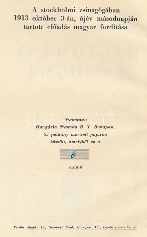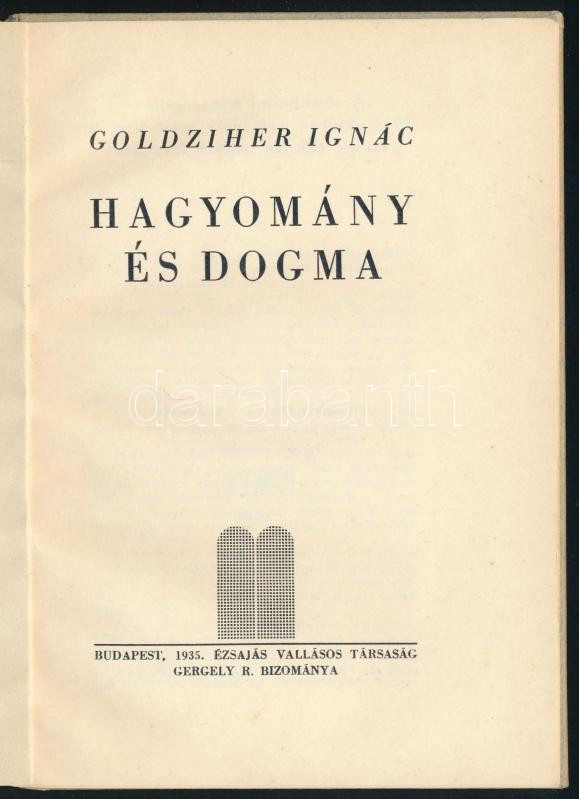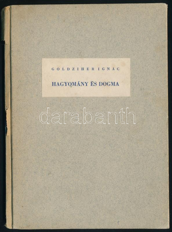 Goldziher Ignác Hagyomány és dogma. A stockholni zsinagógában 1913 október 3--án újév másodnapján tartott előadás magyar fordítása. Bp., 1935. Ézsajás Vallásos Társaság Gergely R. bizománya. 55 példány merített papíron készült melyből ez a 6. példány. 55/6 példány. Kiadói, kartonált papírkötésben, gerincén kis sérüléssel. Rendkívül ritka!