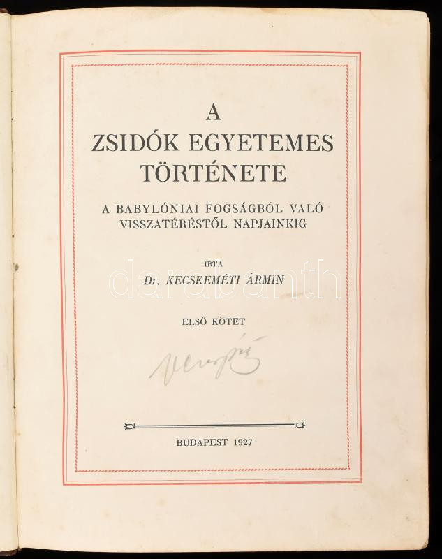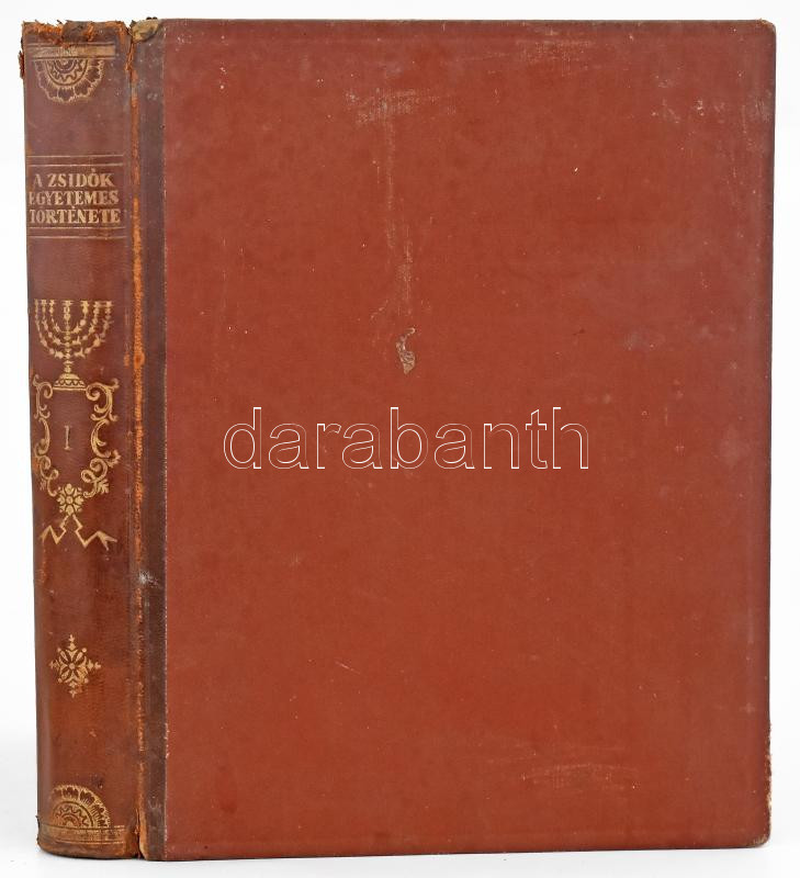 Kecskeméti Ármin: A zsidók egyetemes története. A babylóniai fogságból való visszatéréstől napjainkig I. Írta: Dr. - -. Az Izr. Magyar Irodalmi Társulat kiadványai XLVII-XLVIII. Bp., 1927., Izr. Magyar Irodalmi Társulat, (Korviny-ny.), 344+VIII p.; Kiadói aranyozott gerincű félbőr-kötésben, vaknyomásos táblákkal, kissé sérült gerinccel.
