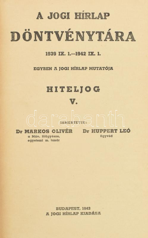 Markos Olivér - Huppert Leó: A Jogi Hírlap döntvénytára 1939. IX. 1.- 1942. IX. 1. Egyben a Jogi Hírlap mutatója. Hiteljog. V. Ismertetik: Dr. - -, Dr. - -. Bp., 1943, Jogi Hírlap,(MTI Rt.-ny.), 360 p. Átkötött félvászon-kötés, apró kopásnyomokkal.