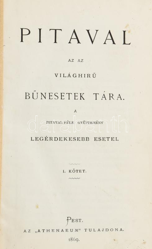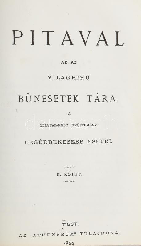 Pitaval az az világhírű bűnesetek tára. A Pitaval-féle gyűjtemény legérekesebb esetei. Pest, 1869, Athenaeum, VI+2+318 p.;IX+1+297+3 p. Átkötött félvászon-kötés, kissé kopott borítóval.