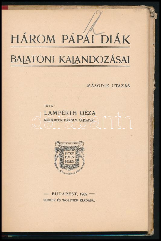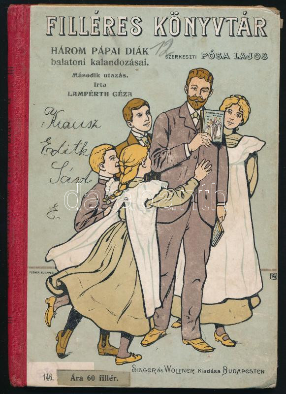 Lampérth Géza: Három pápai diák balatoni kalandozásai. Második utazás. Mühlbeck Károly rajzaival. Filléres Könyvtár 146. köt. Bp., 1902, Singer és Wolfner, 59+(5) p. Kiadói illusztrált félvászon-kötés, kissé sérült borítóval, néhány kissé foltos, sérült lappal, tulajdonosi névbejegyzéssel.