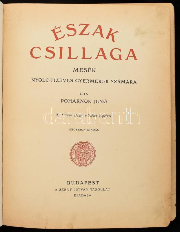 Pohárnok JenÅ‘: Észak csillaga. Mesék nyolc-tÃzéves gyermekek számára. K. Sávely DezsÅ‘ művészi képeivel. Bp., [1931.], Szent István-Társulat, 103+1 p. 4. kiadás. + 2 (szÃnes képtáblák) t. Lapszámozáson belül számos egészoldalas és szövegközti illusztrációval. Kiadói félvászon-kötés, kopott, javÃtott borÃtóval, javÃtott gerinccel és kötéssel, néhány lapon szakadással, foltos lapokkal, a rajzok egy részénél szÃnezésekkel.