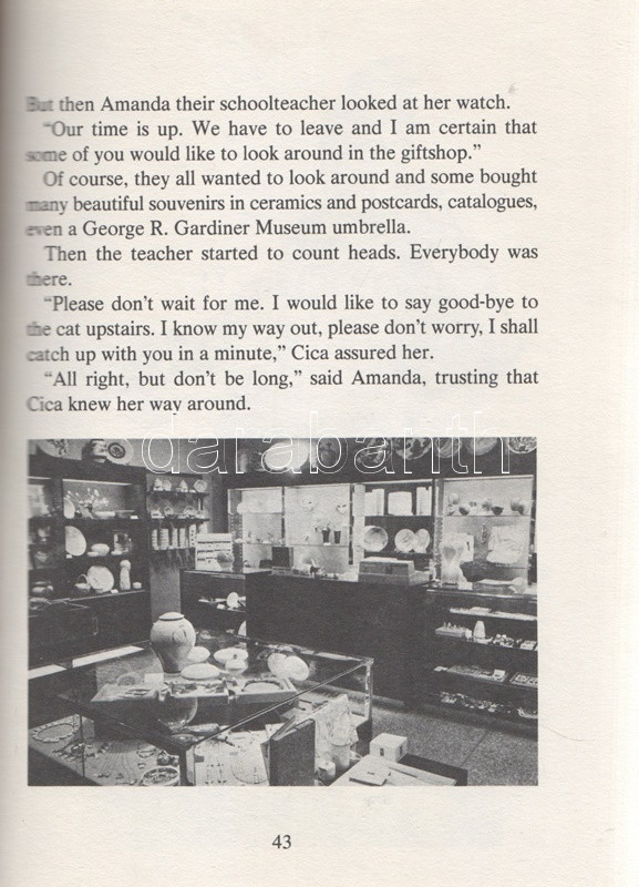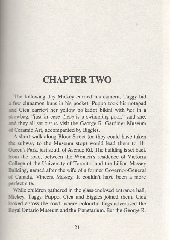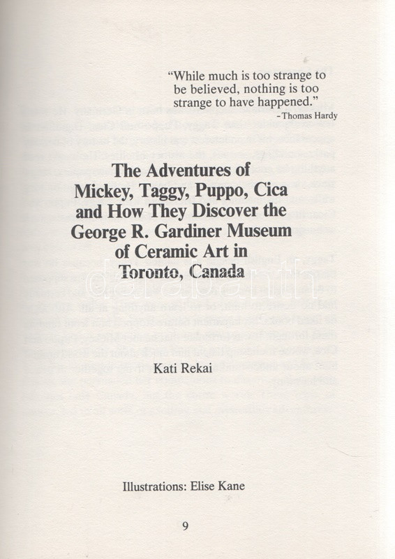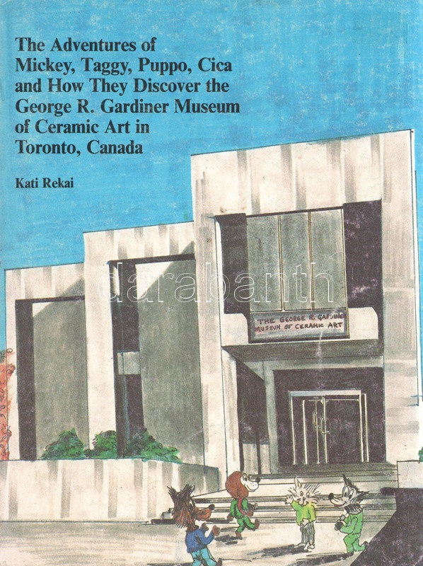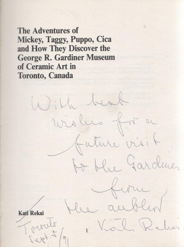 Rekai, Kati: The Adventures of Mickey, Taggy, Puppo and Cica and How They Discover the George R. Gardiner Museum of Ceramic Art in Toronto, Canada. Illustrations by Elise Kane. (Dedikált.) Toronto, 1987. Canadian Stage and Arts Publications Ltd. 64 p. Első kiadás. Dedikált: ,,With best wishes for a future visit to the Gardiner [Museum], from the author, Kati Rekai. Toronto, Sept 5/91". Rékai Kati (1921-2010) magyar származású kanadai írónő színes és egyszínnyomású rajzokkal gazdagon illusztrált ismeretterjesztő meseregénye. Az írónő már korábban is publikált gyerekeknek szánt, állatszereplőket felvonultató, kalandos útikönyveket, melyek közül útikönyvünk a szerző lakóvárosának, Torontónak múzeumába vezet. Fűzve, színes, illusztrált kiadói borítóban. Jó példány.