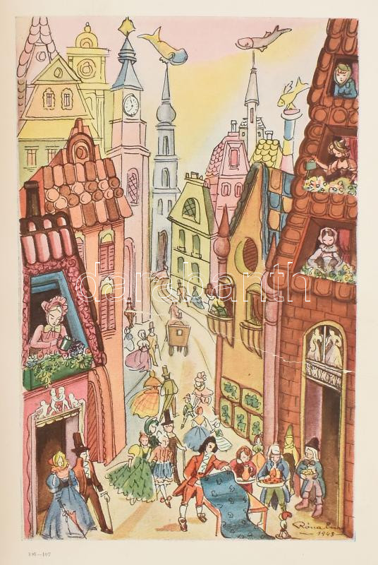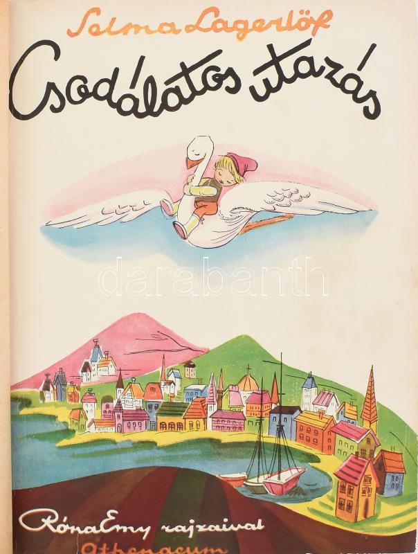 Selma Lagerlöf: Csodálatos utazás. (Nils Holgersson.) Ford.: Kállay Miklós. Róna Emy rajzaival. Bp.,[1949], Athenaeum, 448+2 p. + 2 (színes képtáblák) t. Oldalszámozáson belül szövegközi és egész oldalas grafikákkal gazdagon illusztrált kötet. Kiadói, aranyozott egészvászon-kötésben, vaknyomásos táblákkal, kopott borítóval, egy tábla javított.