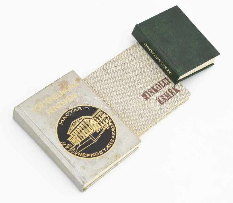 3 db numizmatikával kapcsolatos minikönyv: Horváth Zoltán: A Nehézipari Műszaki Egyetem Emlékérmei. Miskolc, 1985. készült 900 számozatlan példányban.+ Miskolci érmék, +Történelműnk pénzeken.