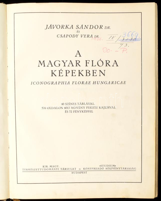 Jávorka Sándor és Csapody Vera: A magyar flóra képekben.Iconographia florae Hungaricae. 40 színes táblával, 4017 növény fekete rajzával és 72 fényképpel. Budapest 1934. Kir. Magy. Természettudományi Társulat és Studium Könyvkiadó. Kissé laza egészvászon kötésben, címlapon feljegyzéssel