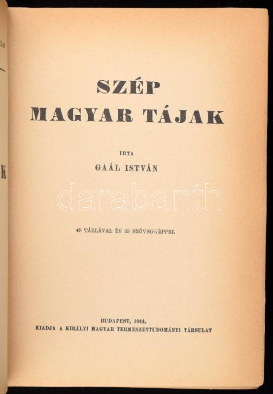 Gaál István: Szép magyar tájak. Budapest, 1944, Királyi Magyar Természettudományi Társulat. Kiadói aranyozott gerincű félvászon kötés, kissé foltos, kopott borítóval, fekete-fehér fotókkal illusztrálva. Egyetlen kiadás.